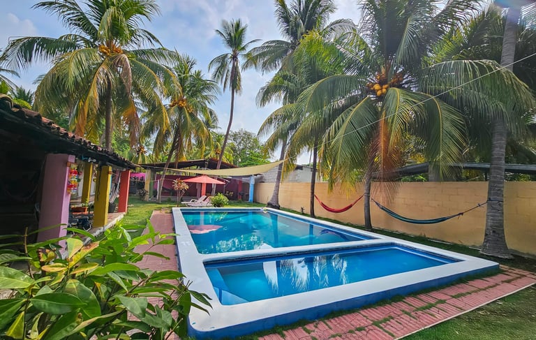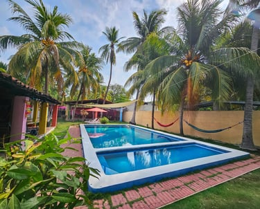 Entre palmeras y brisa marina se encuentra este encantador rancho de playa, un rincón perfecto para desconectarte del ruido y disfrutar la calma del Pacífico salvadoreño. Con una refrescante piscina rodeada de hamacas, jardines y el sonido del mar de fondo, aquí cada momento se convierte en una experiencia de descanso y alegría.